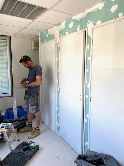On a monté les portes du bureau de Guillaume et de la duplication avec un premier panneau fixé."