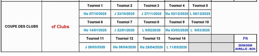 tournois de club (simultanés inclus) organisés exclusivement du 1er octobre 2025 au 14 mai 2026, hors tournois